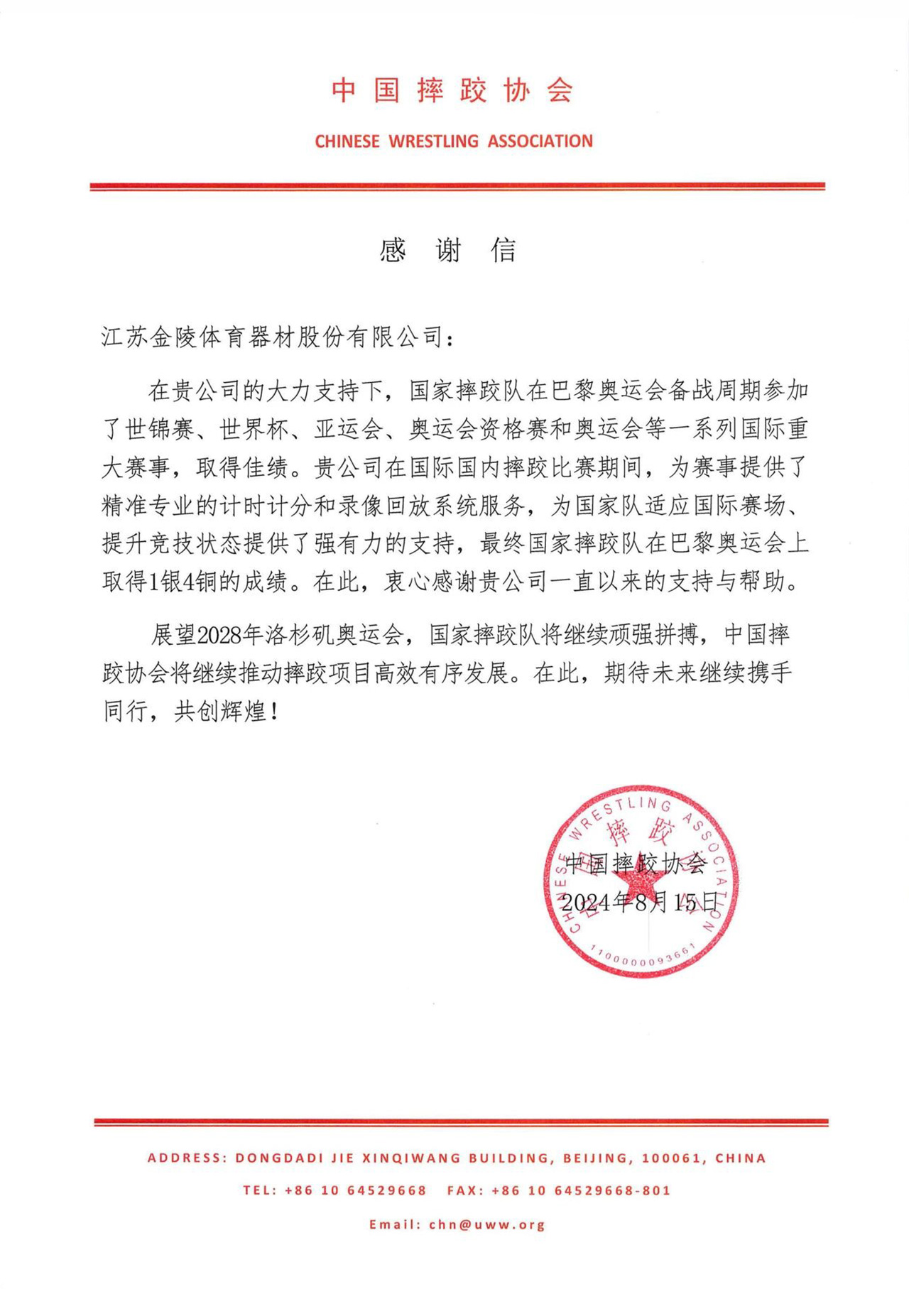 近日,中國摔跤協(xié)會向金陵體育發(fā)來感謝信,感謝金陵體育為中國國家摔跤隊奧運爭光做出的貢獻。