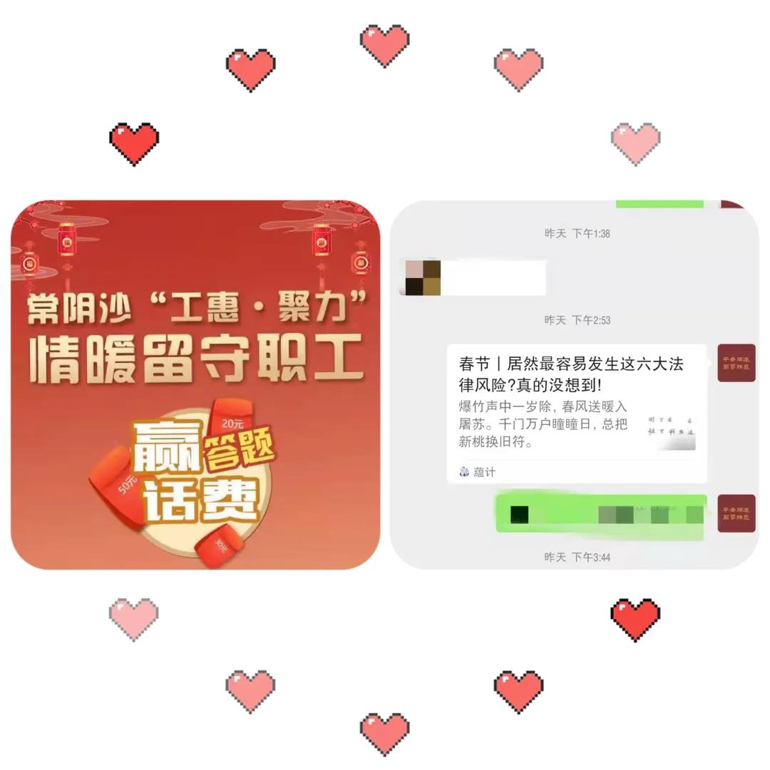 正月初一至初五常陰沙工聯(lián)會(huì)線上開(kāi)展新春答題贏話(huà)費(fèi)活動(dòng)。通過(guò)微信群等推送“以案釋法”案例等方式,為留守職工宣傳“喝酒不開(kāi)車(chē),開(kāi)車(chē)不喝酒”“喝酒需謹(jǐn)慎,勸酒須擔(dān)責(zé)”等春節(jié)期間常見(jiàn)問(wèn)題,同時(shí)也宣傳了疫情防控信息和知識(shí)。